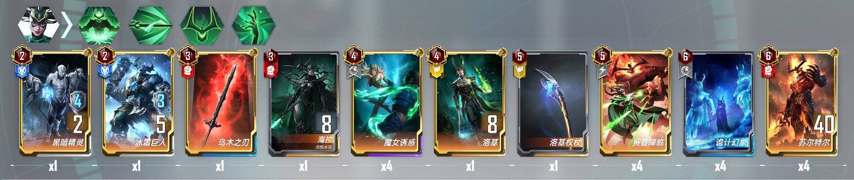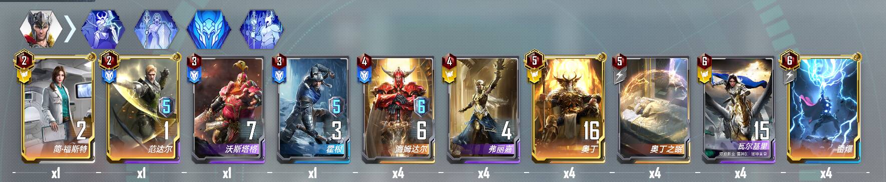 奥丁除了本身的打雷特效外,他还具有【穿甲】和【坚甲】(完成终幕后)的高贵词条。什么卡组最怕穿甲?那就是【复联】和【瑟曦】。于是,如果我们能把奥丁的身材变大,他是可以成为【一拳打穿索尔或者美队】的【肌肉男奥丁】(笑)。所以我们需要加入高速成长身材的二人组——