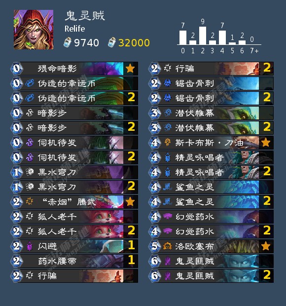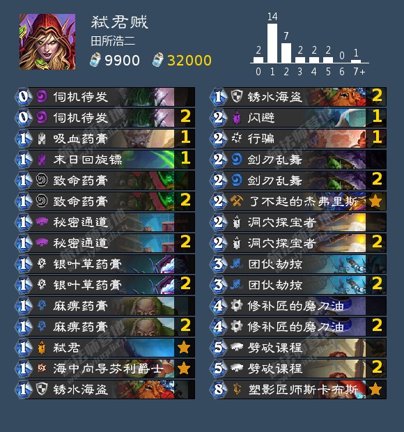 投稿人用这套卡组在300-400名徘徊,起手全力找刀,打快攻找麻痹药膏,只要不断刀基本能赢,银叶草药膏是第二核心。
