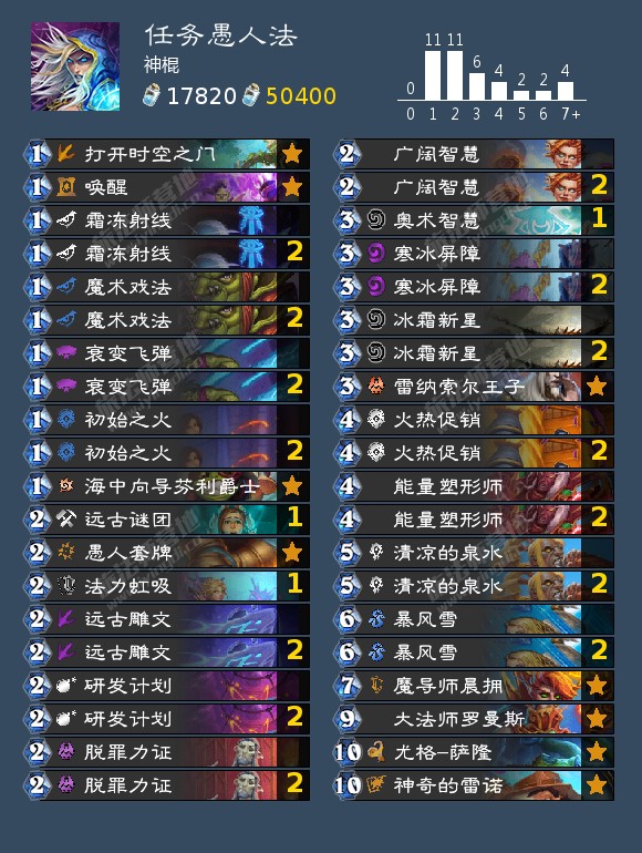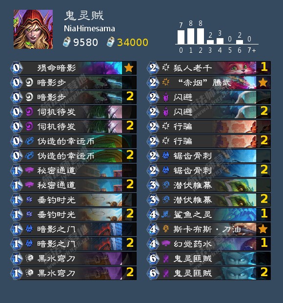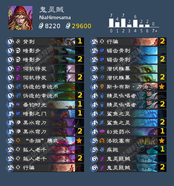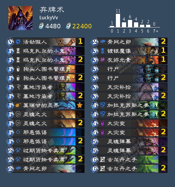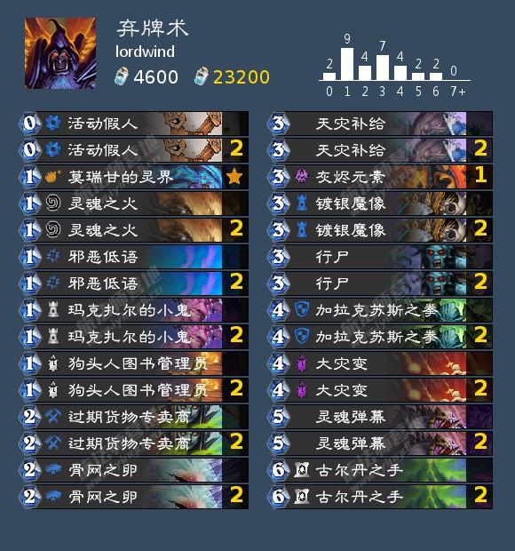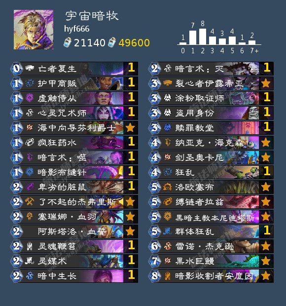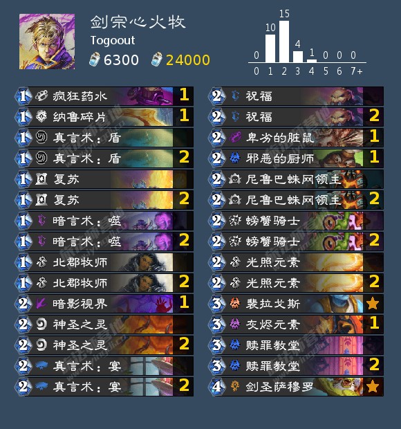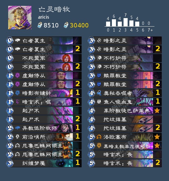 aricis半步月榜的亡灵暗牧。起手需要留过牌,打铺场职业留噬和布缝针。暗言术:丧是两段伤害分开算,所以配合1个虚触侍从打到脸上就是6,2个就是8。不死盟军不贪,手里有亡灵就可以直接打。整套卡组的亡灵都可以用起尸术复活(鱼人吸血鬼注能后),亡者复生的使用时机在这里也有讲究。尼鲁巴可以卡盗贼和萨满,有空间就直接出。卡组相较于普通暗牧优势在于解场和突然爆发,并且拥有足够的信息差,对手防不胜防。