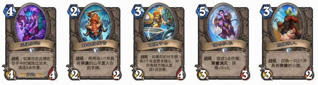 例如巫婆娜迦、群羊指挥官、骑士队长、碉堡中士、放猪牧人等等。为什么DK现在这个环境被暴削N次还是很强,主要就是他前期超强的控场能力,往往一个碎骨手斧就能把对面压住,而新环境各职业多少都能选到一些中立解牌,有更多操作空间来拉扯了。