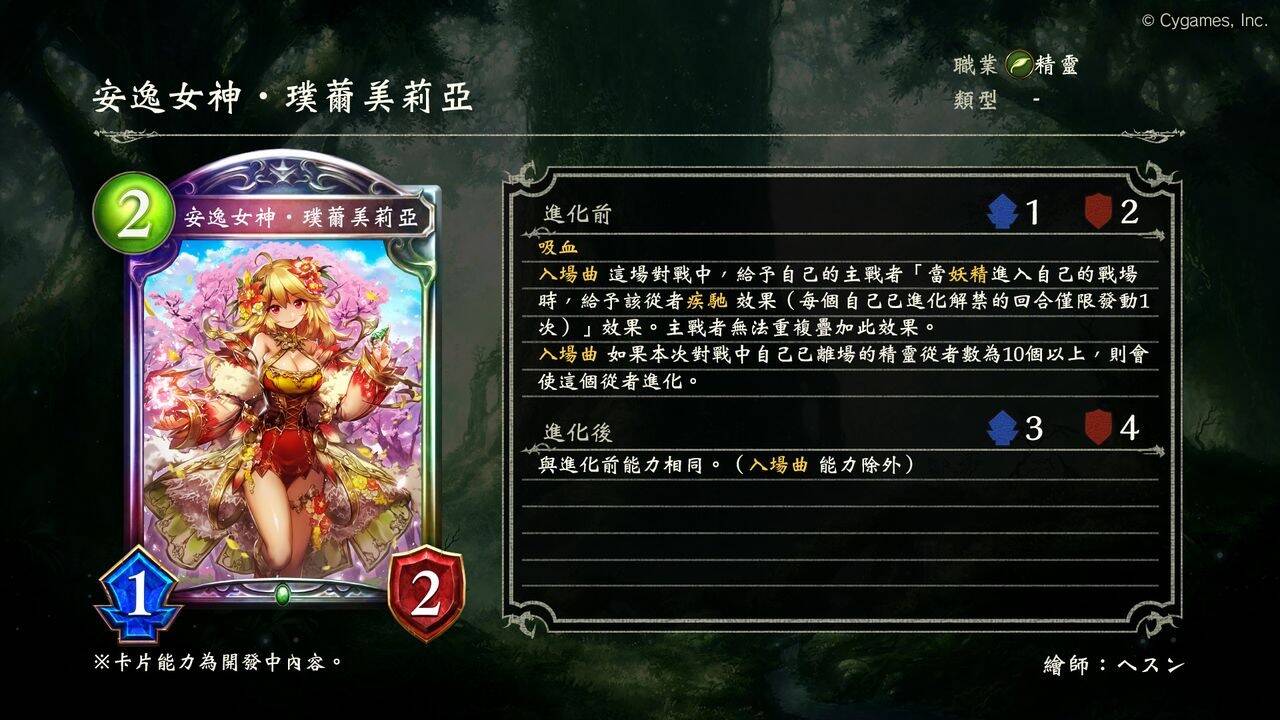 入场曲 本局对战中,给予自己的主战者“每当妖精进入自己的战场上时,给予该随从疾驰能力。(进化已解禁的回合内才能发动,每个回合只能发动1次)”的能力。主战者无法重复叠加此效果。