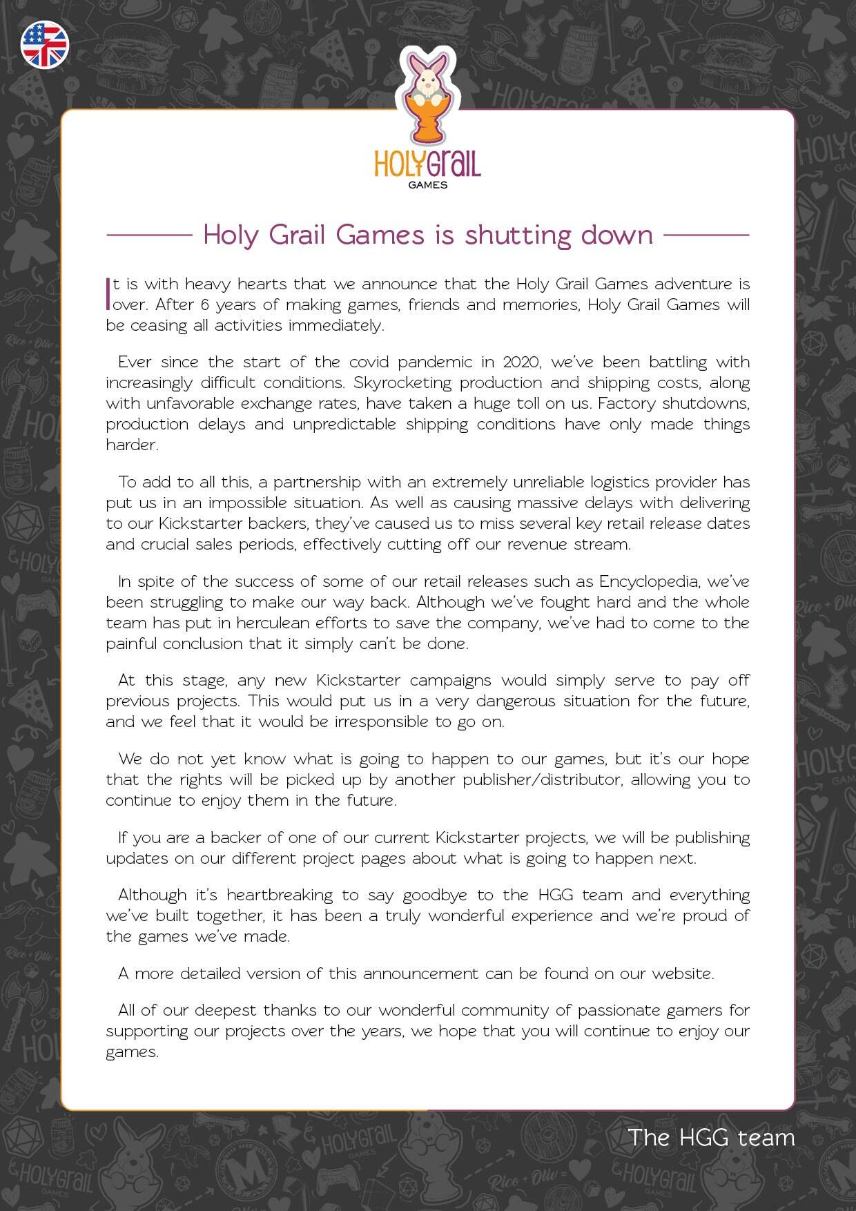 出版商Holy Grail Games正式宣布,其公司已进入破产程序,从本周开始,团队都将被解散。