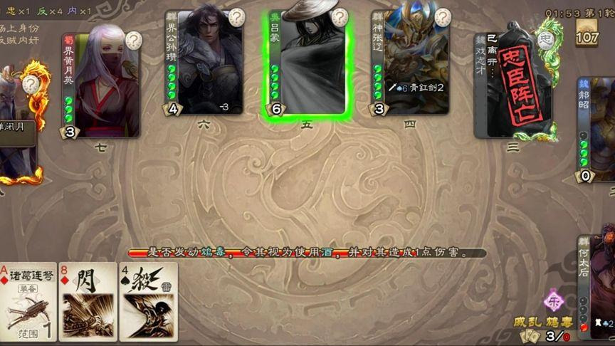 在8人场中,第一回合基本上都是巩固自己的实力。此时新手玩家的操作是上装备,随机控制一个敌人,或者攻击一名敌人。不过老玩家却经过首回合大家的出牌行为,已经做出了判断谁是敌人谁是队友,也许无法百分百猜对,但至少能确定2-3名角色的身份,之后针对他们用牌。