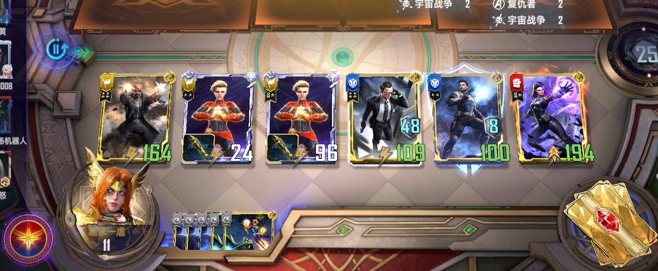 重要细节:使用特工密信以前,花光所有的宝石,尽可能给场上多放神盾局单位,然后最后再使用特工密信。这样可以给神盾局加更多的buff,