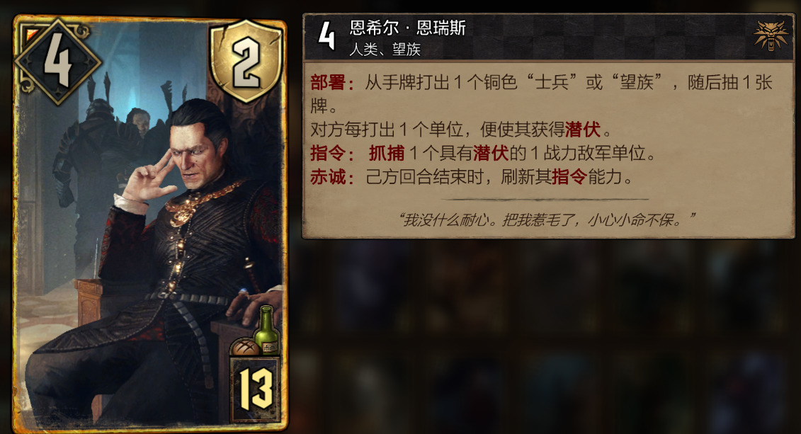 恩希尔他爸!!我摸着良心说,恩希尔不配做大金,垃的一匹,为什么?因为恩希尔没法做到稳定使人潜伏,北国与帝国都能有锁定,直接将恩希尔废除,怪兽吞噬流可以直接抓捕4拿走,吸血鬼就直接放血,4点身材的恩希尔分分钟流血**,而恩希尔的抓捕纯属于聊胜于无的添头技能,带来的收益少之又少,,说句不好听的我还嫌弃1点战力的随从卡位置。