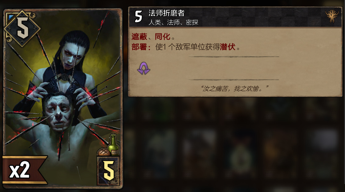 折磨着是拥有遮蔽效果的,我完全没法处理这个卡,r1的时候他就用自己的技能小锁定,搭配的折磨着与飞镖男,压制这着我,被他拿下了r1.