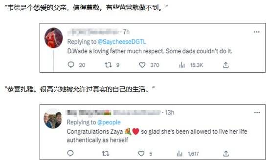 一方面,有网民不断称赞韦德是个好父亲,值得他人学习,并恭喜扎雅能够以“真实的自己”生活。