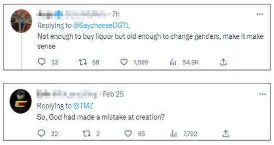 有人还讥讽道,“还没到可以买酒的年龄但已经可以改变性别了。”“所以,上帝在创造时犯了一个错误?”