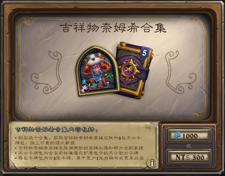 含构筑模式术士新皮肤“吉祥物奈姆希”和5术士包,售价1000符文石。