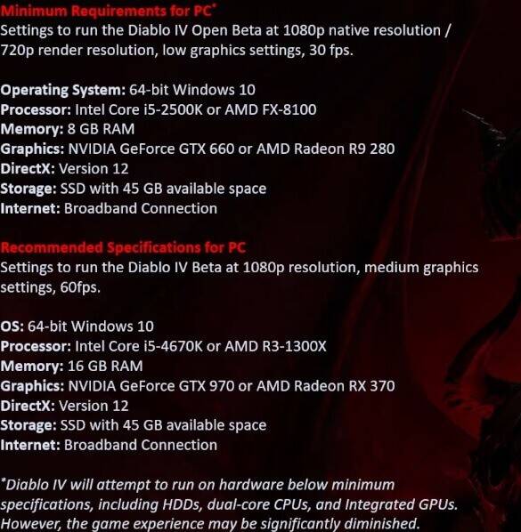 暴雪刚刚公布了《暗黑破坏神4》公开测试的官方PC系统要求。本次测试将于3月24日向所有玩家开放。