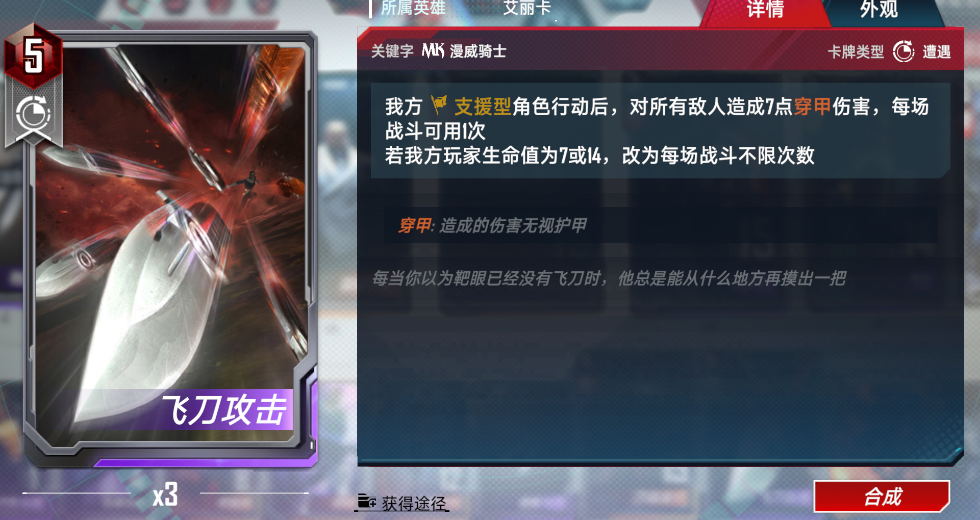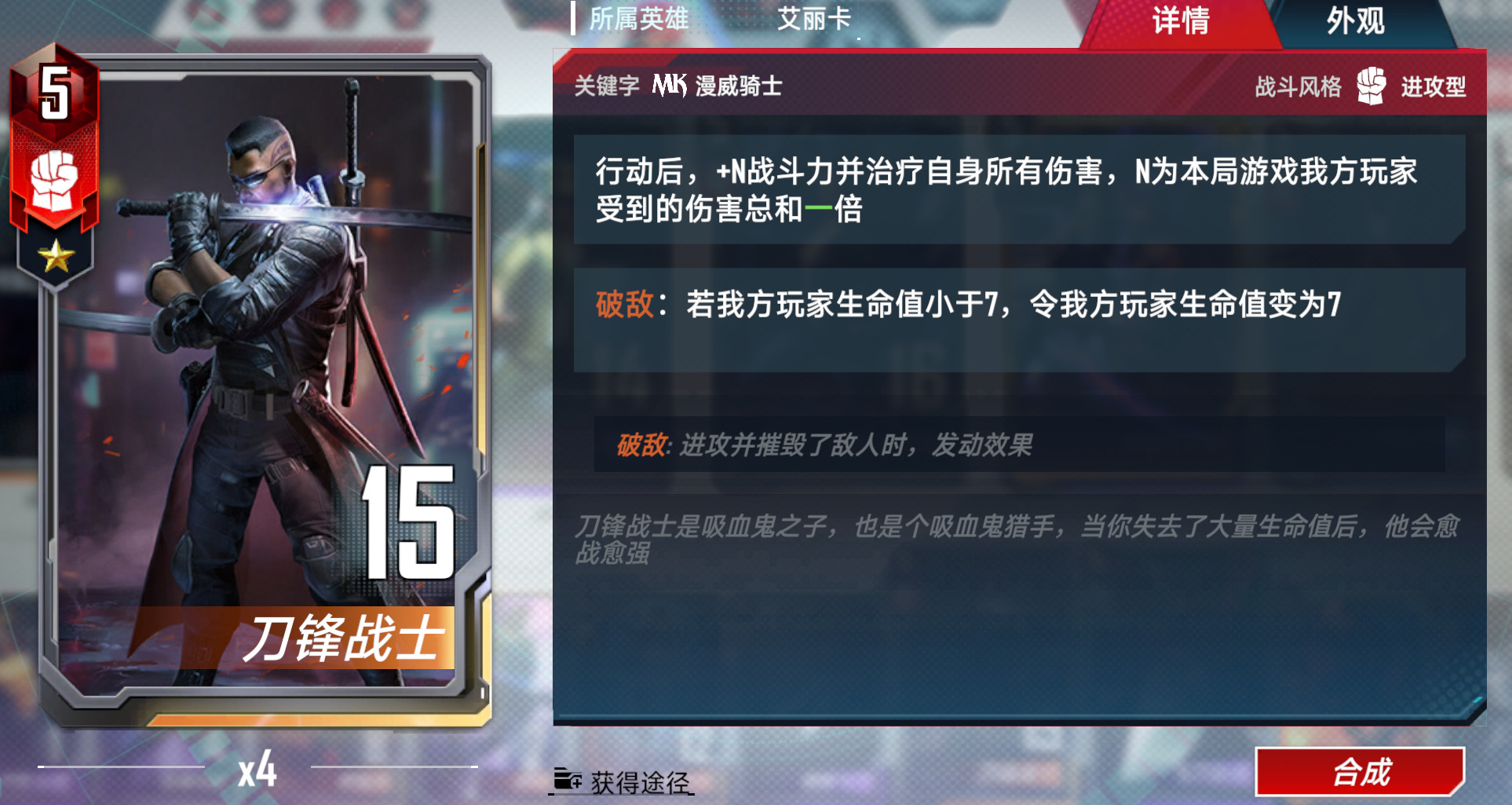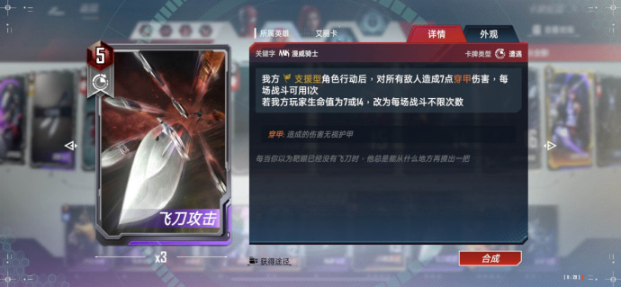 钢决和飞刀简直是一对完美的组合。我第一次见一个卡组可以锁血锁的这么无脑,在四回合或五回合拿到飞刀之后基本可以无脑打钢决。当然也有特殊情况,比如对方是个速本秘闻或者死侍带了小小就可能会输掉,除了刀锋和小小以及糊成狗的夜魔侠,基本没有牌可以和四五六回合的飞刀抗衡。疯狂钢决,多抬走一家,你吃分的可能就会更大一分。