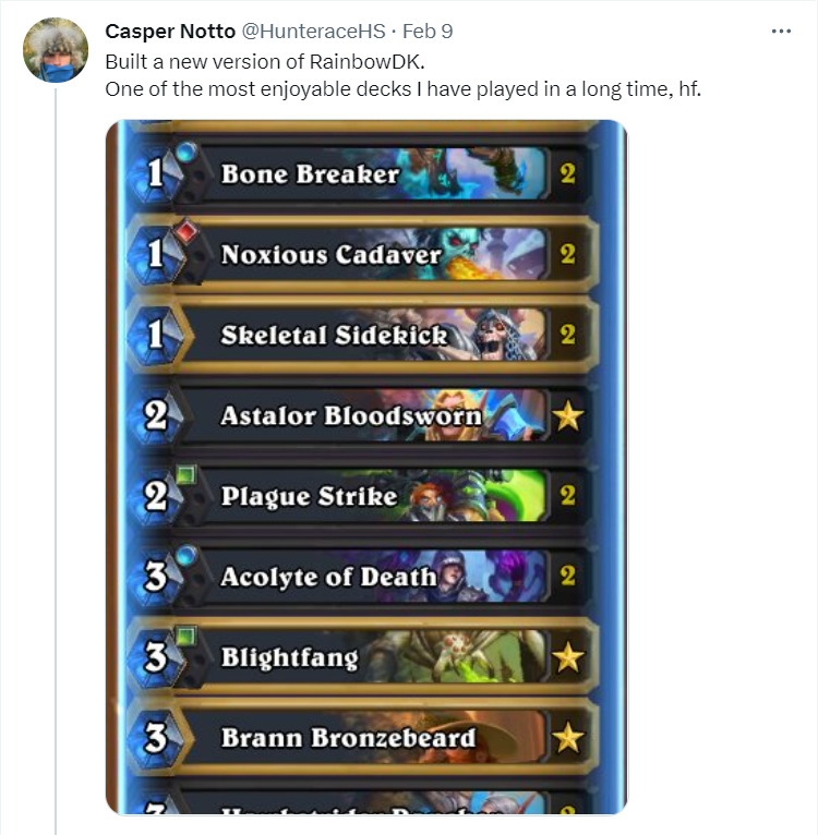 The Angry Chicken昨天发布了采访Cora的第500期特别节目,这是近期比较久违的设计师社区互动了。随着炉石年更替的临近,同时也作为概念组首席和纳斯利亚堡的领设,Cora从构筑的内容更新方面回顾了多头蛇年,对今年也进行了一些微小的展望。