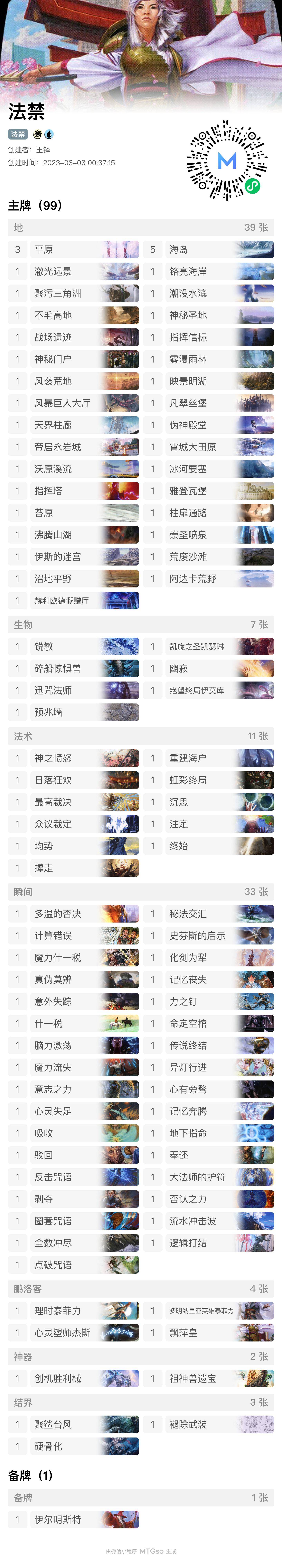 大家好我是来自南京的牌手阿逢,这次南京“大光头鸡排杯”南京法禁EDH比赛有幸进入四强,准备和大家分享一下我这次的参赛经历。我作为一个neo时期脱坑战棋入坑万智的牌手,到现在牌龄刚刚超过一年,入坑万智牌的第一个赛制就是海怪禁edh,在这也要感谢陈老爷、吴裁、竹老师作为我入坑的引路人,同时他们三人也为南京本地1v1edh环境做出了很多贡献,本次大鸡排杯也是竹老师组织举办。现在的法禁环境在我看来主打的就是一个剪刀石头布,跟先驱差不多,套牌克制非常明显,组合技套牌(主要是几个掘坟)克制中速和快攻,中速和快攻比较好打大控,大控又面对组合技占优。最近这几个月因为环境内迪哈达的崛起,本地也有南京法禁之王我的好兄弟咲夜一直在玩掘坟小女孩,同时我也因为龙盾杯的原因备战先驱白蓝控,所以在大约两个月前,我组了伊尔明斯特和tivit两个偏控制的主将进行实验,确认了tivit玩不顺手之后,主要练习了大约一个半月的伊尔明斯特作为参赛套牌。