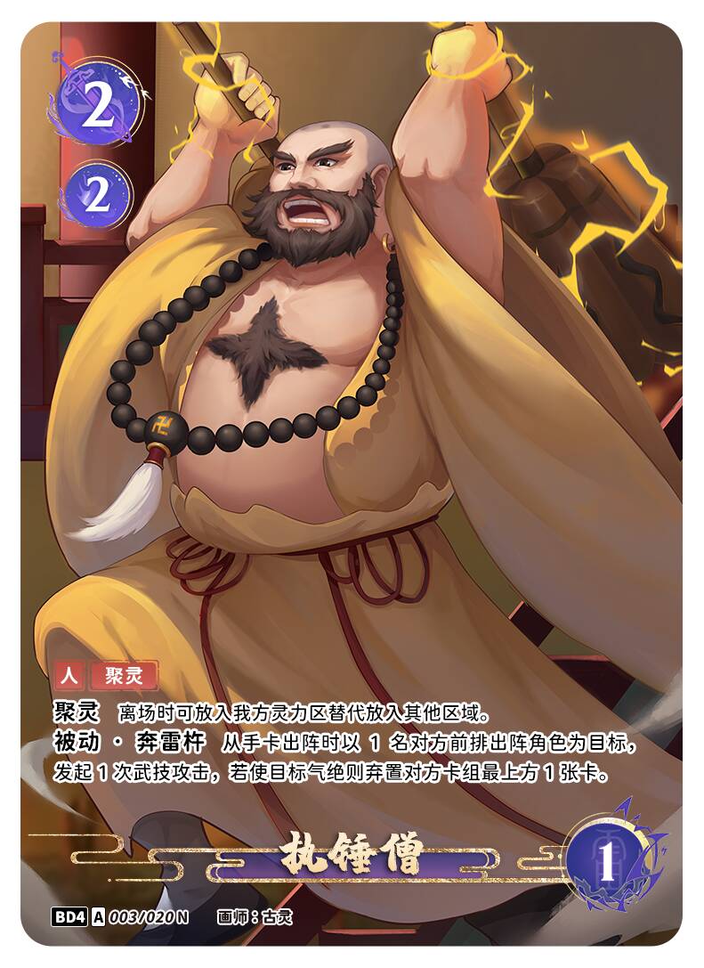 “执锤僧”,不仅有着强力的卡面数值还拥有着出阵时即刻发动武技的被动技能,选择对方前排的一名出阵角色为目标发起1次武技攻击,若目标气绝则对手将弃置自身卡组最上方的1张卡,能够达到在削弱对方前场防御的同时也削减了对方卡组的效果;