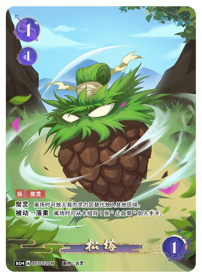 “松塔”,与一般小怪有着相同的卡面数值,但是其自带的被动“落果”可以在自身离场时将“止血草”从卡组中加入到手卡,能够进一步增加下一回合对战时的操作能力。