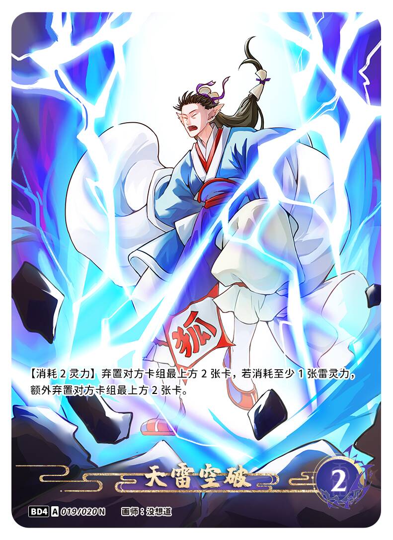 “天雷空破”,通过消耗2点灵力来削减对方卡组的效果,并且其中消耗1点雷灵力时还可以额外削弱对方卡组与其他的雷灵卡牌配合让对方被迫快速消耗卡组从而减少精力,为自身对战增加了一定的优势。