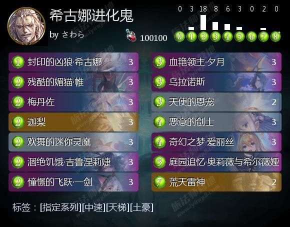 在堆够进化数后,希古娜、夕月和爱丽丝都能高效解场,夕月和爱丽丝还能高效过牌。进一步堆叠进化数后,希古娜、爱丽丝还可参与抢血、斩杀。搭配帷、幼狼的奋战(来自憧憬的飞跃·一剑)等体系受益者,以及乌拉诺斯,便能通过空场伤害取胜。