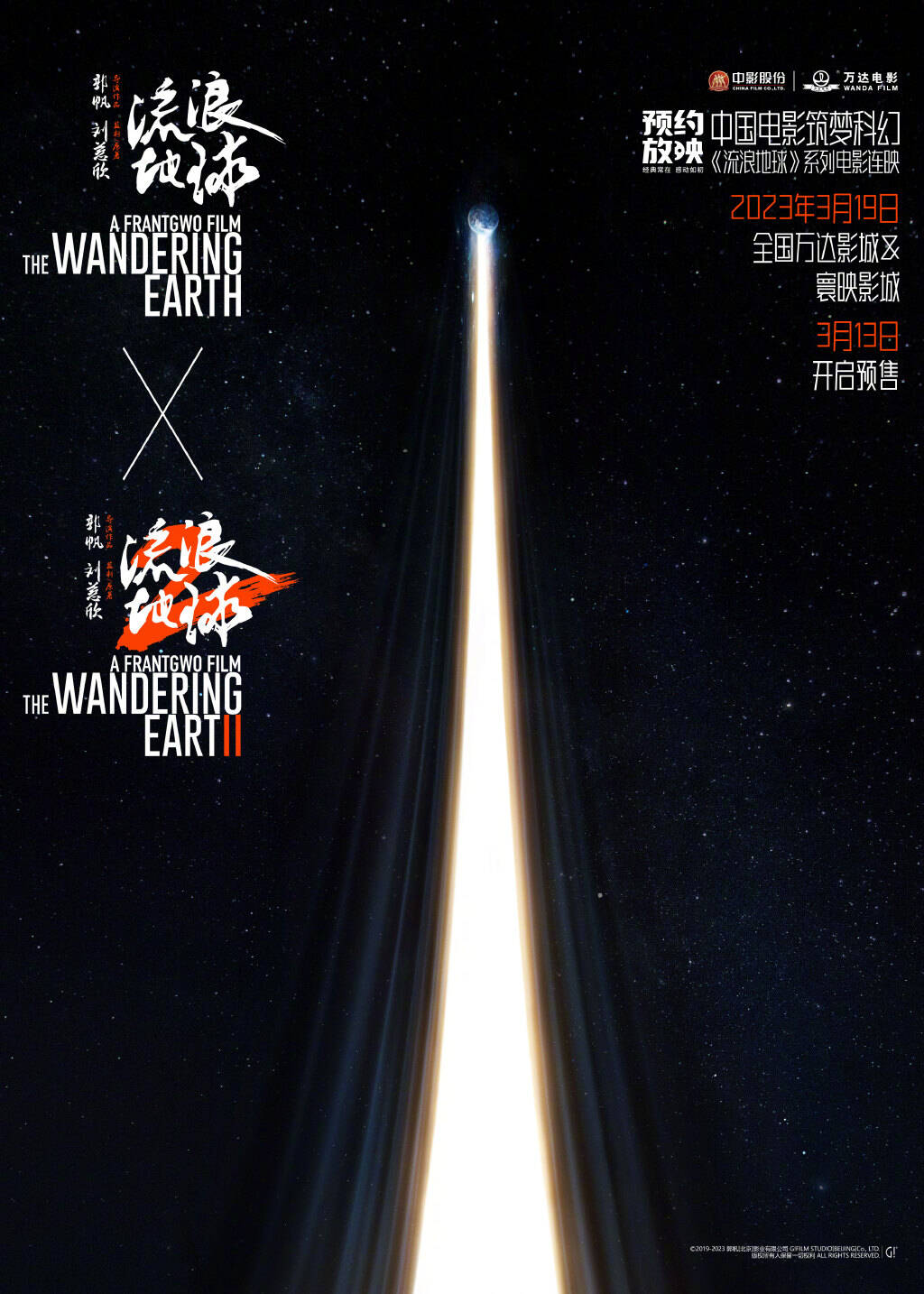中影发行和万达电影联合发起预约放映,即将在3月19日进行“中国电影筑梦科幻”《流浪地球》系列电影连映。3月13日,全国万达影城&寰映影城将开启预售。