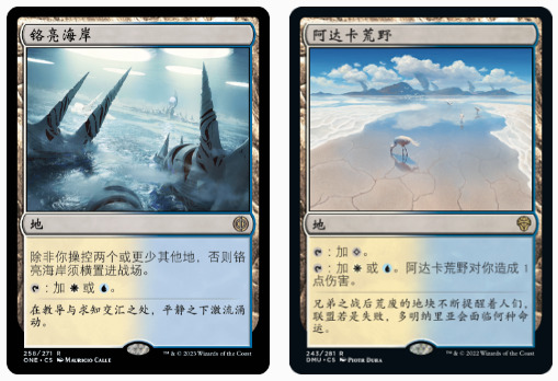 那么衍生的问题产生了,这些新牌又不是刚出的,那之前为什么没有白蓝精怪呢?虽然这些白牌是之前的牌,但阿达卡荒野和铬亮海岸可是这两个系列才印进先驱的啊。在没有痛地和块地之前,这牌用四个天天横进的冰河要塞都调不开颜色,无法支持白蓝双色,因此这也是法术力所带来的质变与支持。