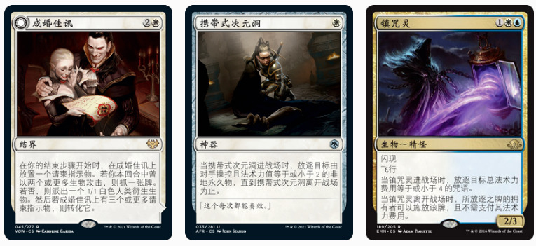 备牌也是同理,携带式次元洞能弥补纯蓝精怪无法后手一回合做出合理动作的问题,虽然证人保护勉强也算个去除,但毕竟只能解生物,而且给对手留了个1/1在场上,后手的时候你会发现这个1和0有多么大的区别的;成婚佳讯则能直接改善红黑中速这一原本的大劣对局,同时提供