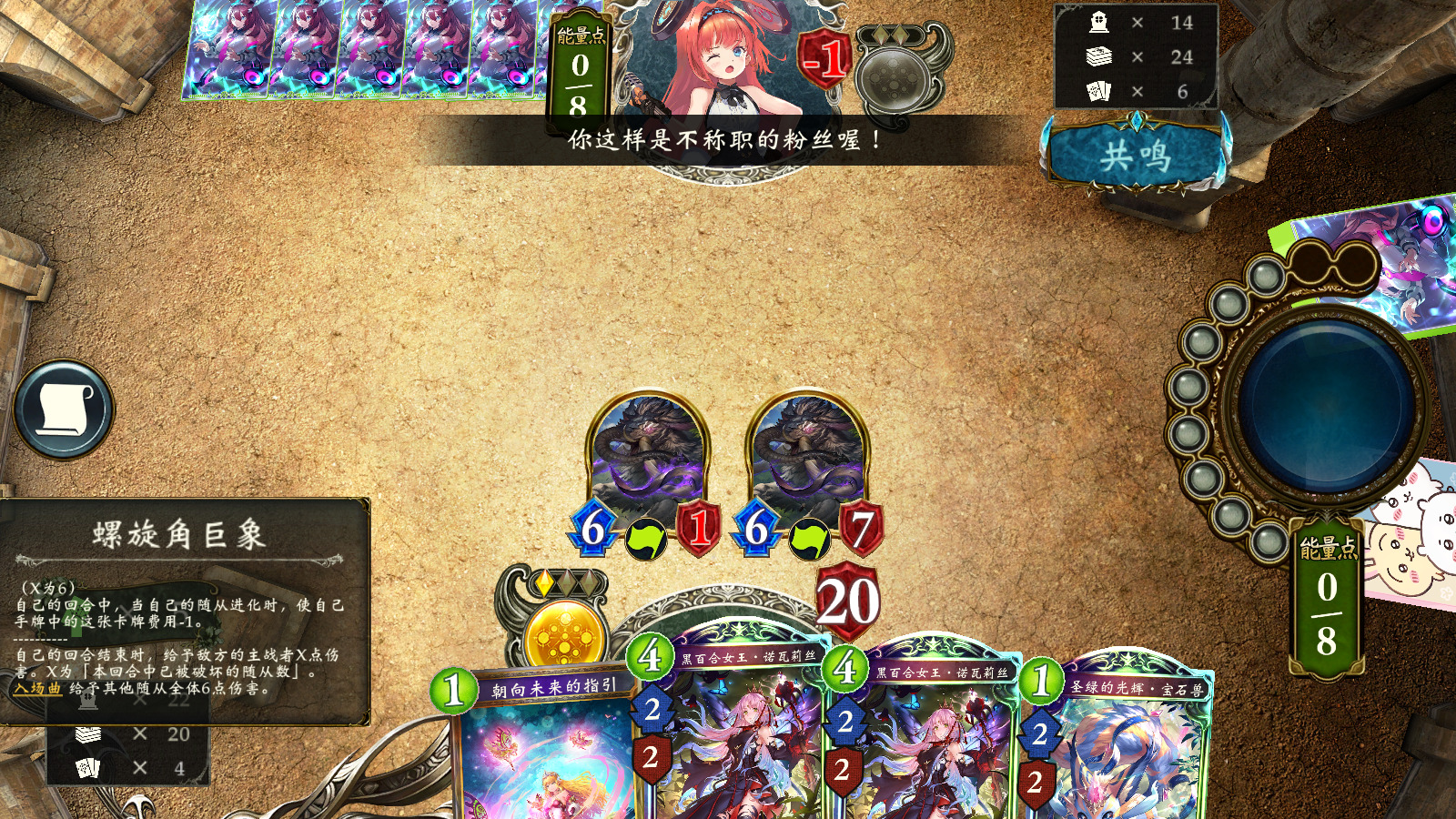 如果难以快速取胜,则要优先运作,过牌寻找奇幻之梦·爱丽丝、巨象等制胜手段,通过解场争取时间。找机会使用能触发额外效果的觉醒,检索巨象。利用花绽的狐耳族民、蕾妮、诺瓦莉丝等组件返场,兼顾堆叠用牌数,以瞬念召唤蕾妮。有蕾妮的情况下,通过她配合舍弟头和另一张精灵随从刷进化、过牌。堆叠已离场精灵随从数,利用璞尔美莉亚刷进化、解场、回血。