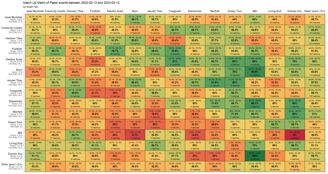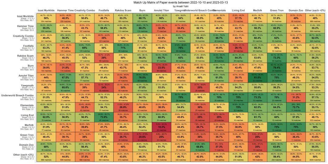下图是摩登主流对局中各个套牌的胜率关系图,希望能对你的换备策略有所帮助。Via@YahiAnael,全部数据源自于MTGMelee线下摩登比赛的真实对局胜率