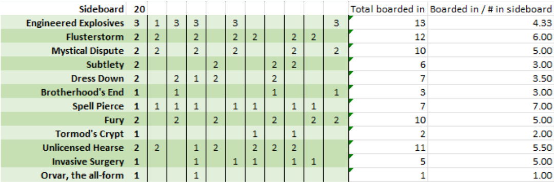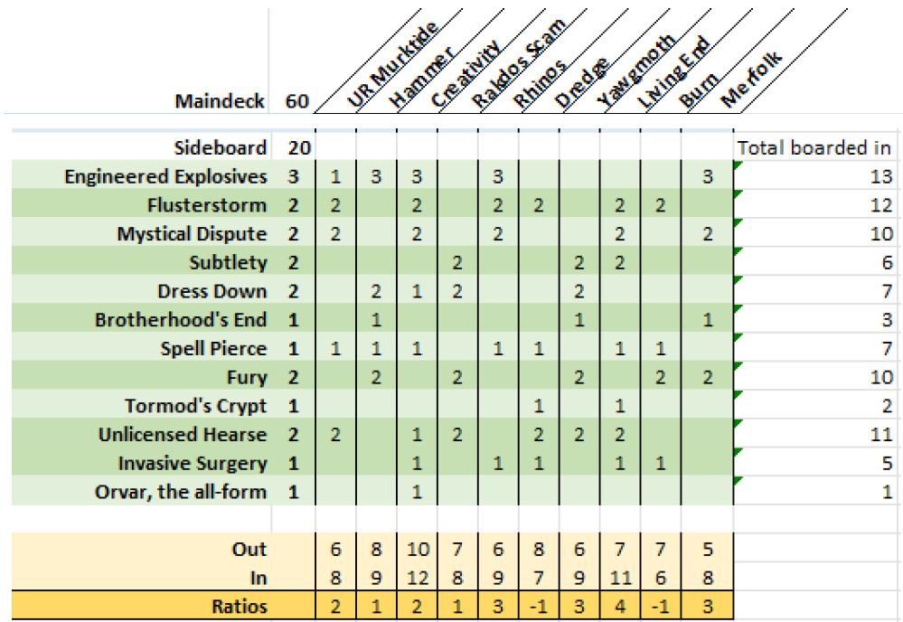 现在我的备牌名单仅剩17张了,我们还需要踢掉两张;从表格中来看,我们有些过度针对的是犀牛与走骨了(要换入的牌多于能换出的差牌);尽管神秘干扰的使用率很高,甚至每个对局中我们都带了2张,所以减少1张可能也是合理的。最后一张的削减总是最难的。正如你所看到的,无论你剔掉哪张都并非十全十美。