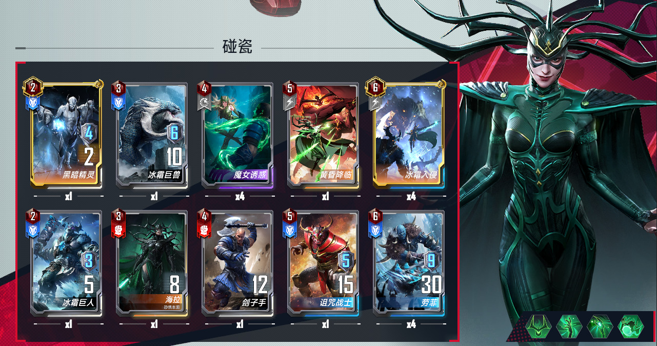 最终对局:这套牌没啥腾挪余地,看魔女杜姆数量,记得给简装武器死的晚一点。而且这套牌容易到上限,四张冰霜劳菲大部分对局10回合可以全齐,护甲10-15倍,女雷身材普遍100/300左右。现在以黄队环境为主,没多少人带反浩克和魔女,环境还是比较友好的。对阵大火的蜘蛛飞刀,结算顺序:飞刀,我方全灭,消灭对方大部分,我方杜姆触发,女雷跳出,对方杜姆触发,我方魔女触发,对方消灭我方女雷,究蛛亡语触发,我方魔女触发,凤凰剑触发,最后那个究蛛是怎么也拿不到的,关键点其实在对方有没有杜姆和凤凰剑。同样的,神盾惊对面第一个回合碰到有飞刀那我们必赢,第二个回合飞刀卖了又要看结算顺序。