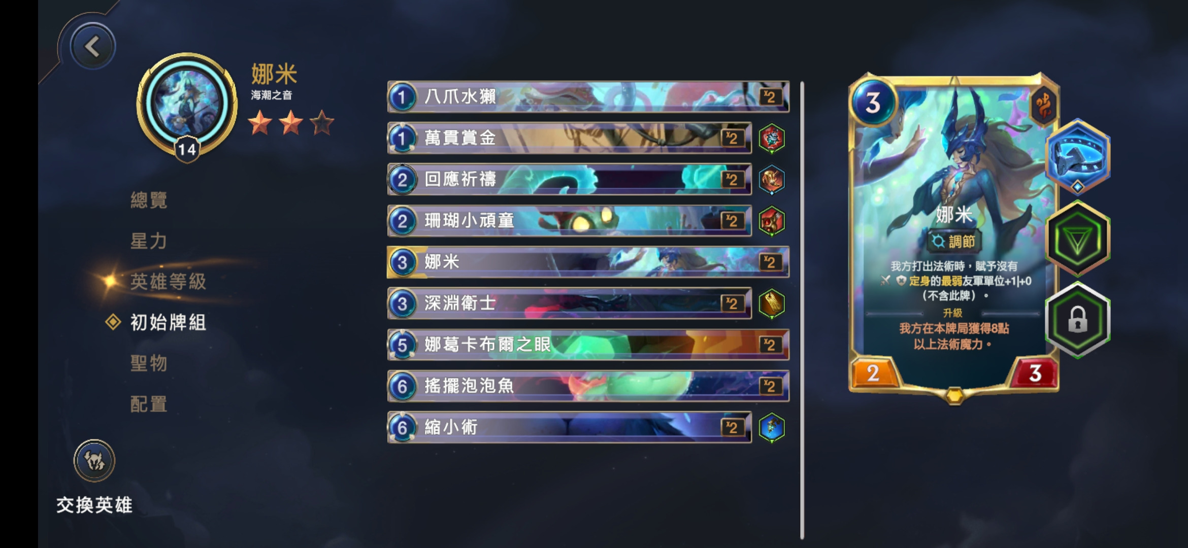 好了,不说那个炮打蚊子的英雄了,来说说娜美吧。事实证明,朴实无华的能力比花里胡哨的东西更有价值,就像游戏王最强的卡牌往往只有一行字一样。一星打出法术回一费,这个能力没有一回合发动次数限制,搭配卡组里大量法术牌,对于娜美升级进度和娜美触发次数都有质的提升,每一次法术回费都能够触发任务进度。尽管娜美多次被躺枪削弱,但星力依然化腐朽为神奇,尤其在于牌组中存在621的情况下,过到621+娜美基本能够锁定胜局。二星过一张法术,尽管有些过于稳健了,补手牌+续航效果也还是不错的。三星或许是觉得回两费会玩出一些奇怪的费用魔术,所以改成了第四张法术生效两次,从牌组本身分析收益最高的是娜美法术和1费找随从,牌组外配合可能是使尽全力之类的大范围直伤和AOE。牌组升级奖励是笔者长时间没见过的靠谱道具,前13级除了213的钩子没太大收益之外,娜美法术结付秒表(变成骤发法术),回应祈祷(海祭2)结付英雄号角都是提升巨大的实用道具。卡牌选择上,看到比尔吉沃特石头或者备战类卡牌可以直接拿,配合摇摆鱼OTK。