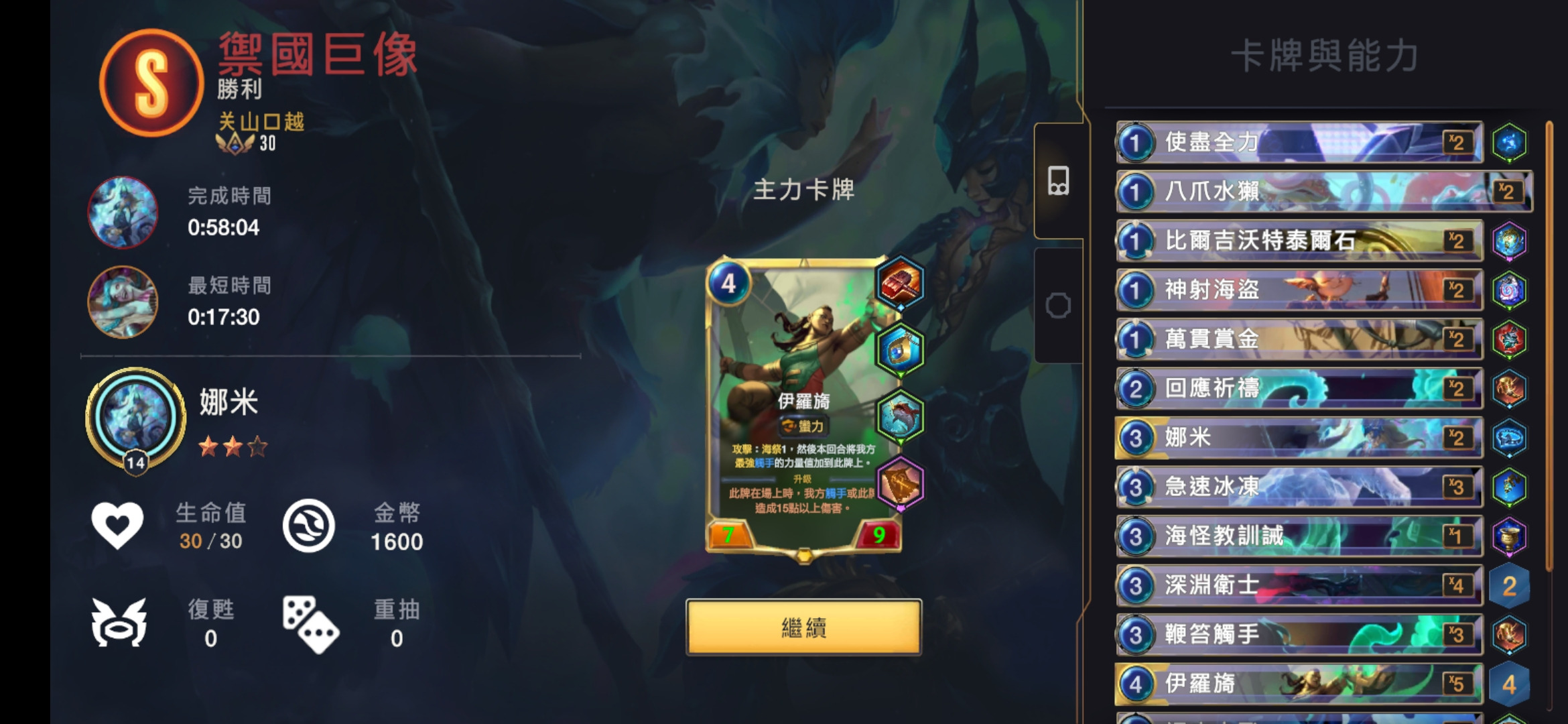 接着来看实战,本来想7级开打,结果不稳定附魔(没打完两关重开给的那个)开局,拿到劫失手把加里奥打死了,所以这次12级开打。无畏先锋关,地狱3希斯莉娅开局,通过娜美加攻强行换,最后万贯黄金找折纸龙(双重攻击)拿下,当然直接用深渊术士也拿下了。