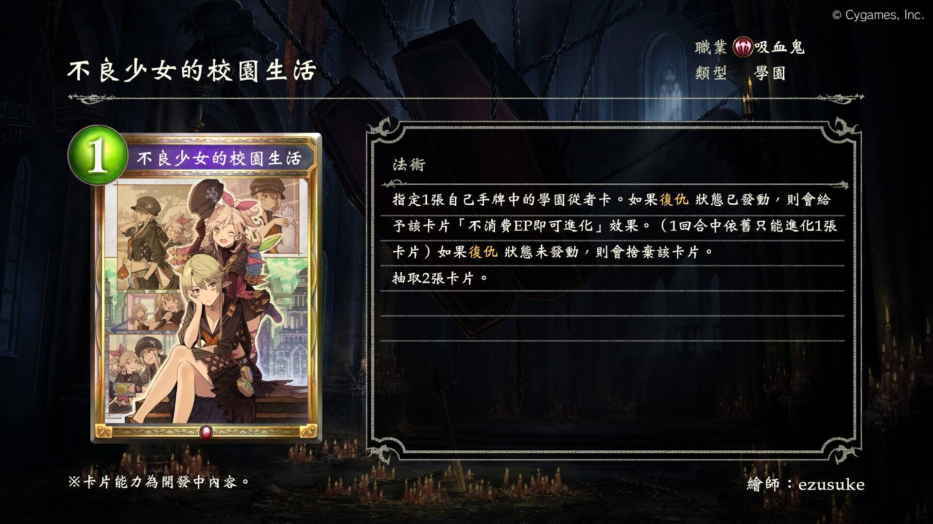 指定1张自己手牌中的学园随从。如果复仇状态已发动,则会给予该随从“不消耗EP即可进化”的效果。如果复仇状态未发动,则会舍弃该卡片。
