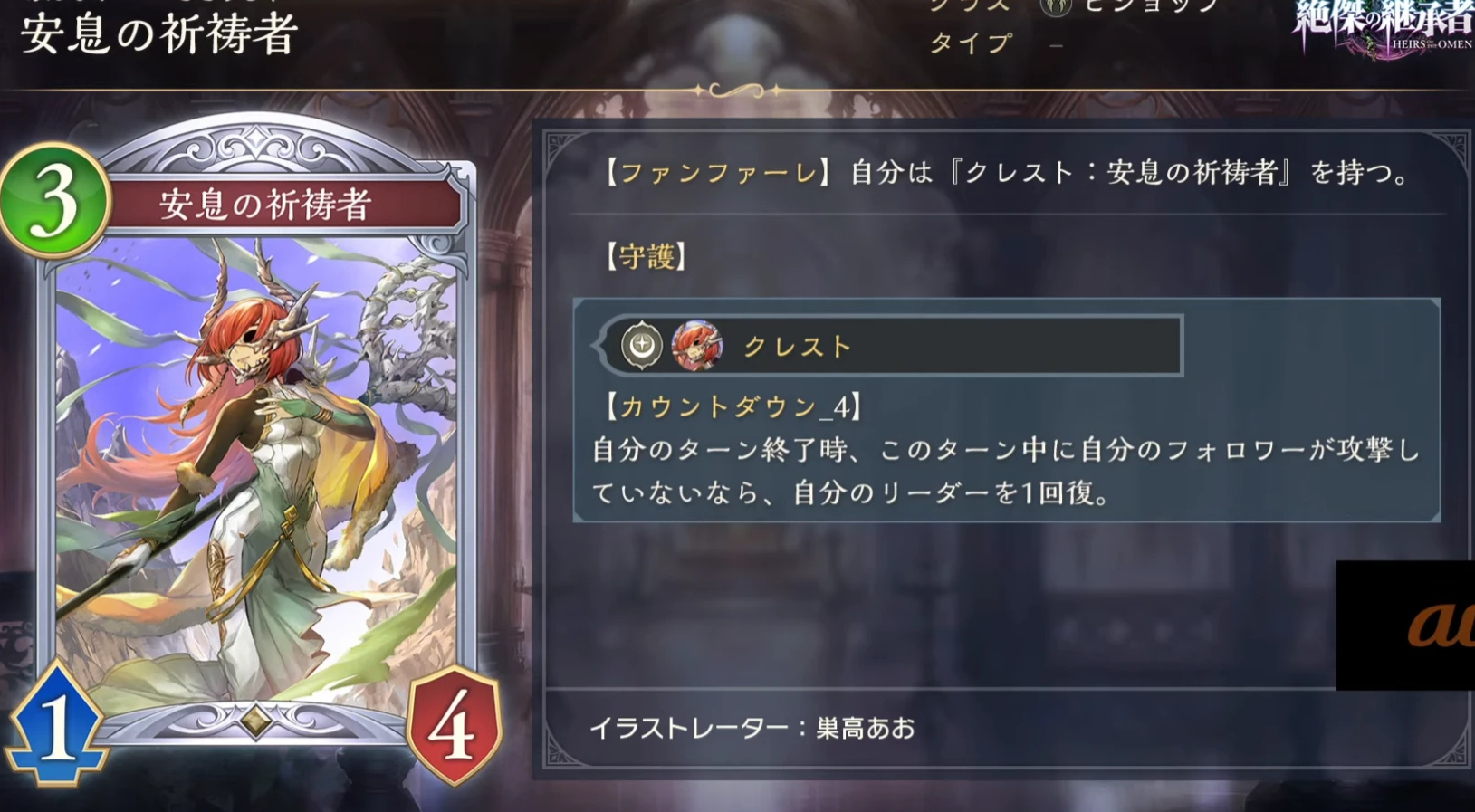 入场曲 如果自己主战者的职业是精灵或者巫师的话,回复自己的PP 1点。死灵法师或者复仇者的话,召唤2个怨灵到战场上。皇家或者龙族的话,破坏1个对方的随从。吸血鬼或主教的话,回复自己的主战者3点生命值。