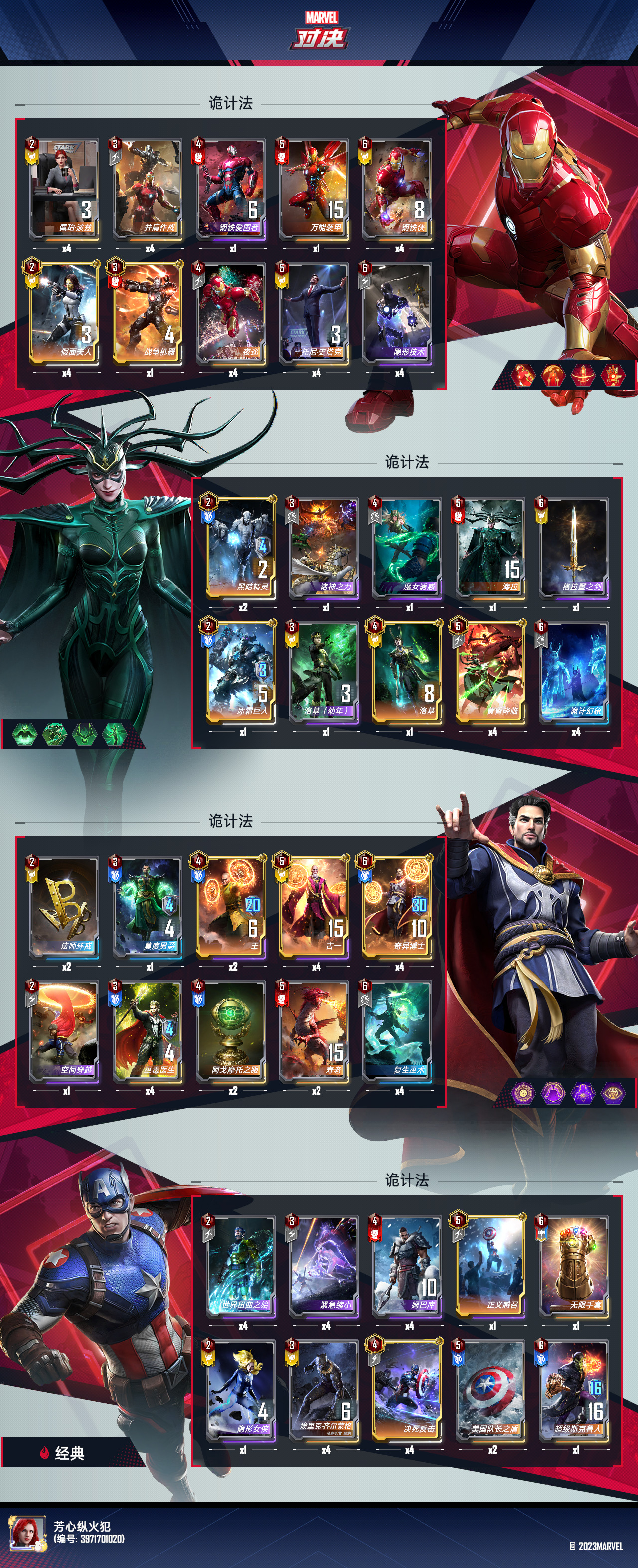 三四五六回合就在三本找血魔组件,打不过就缩小苟活,集齐至少两三张扭,六七回合看情况升本,七八回合是苟活压力非常大的回合,一边开扭搜组件,同时拉战力尽量找到手套,靠手套苟活,手套给谁带很重要,对付星爵海拉这种很可能是格斗浩克的不要给最大身材的怪带,容易打不出来,对付带艾丽卡给大怪带,反正被飞刀先制干掉小怪,一般九回合是成型的回合,慢一点可能要到十回合,注意复制顺序和手牌数量,古一复制后要放在手上不能变为实体,莫度男爵回手足矣,看情况是否要复制姆巴库,后面全部复制博士即可,墩跺也能复制一下王加一点身材,然后用幻象剑把除古一以外的幻象变为实体,最后古一上场,幻象古一不带装备或者带环戒都行 ,之后补齐巫术和诡计幻象即可。成型打绝大多数卡组都是优势,最关键的是团战非常好看。