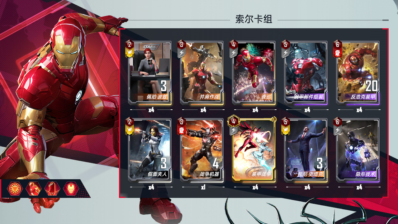 钢甲部件组装4:配合装甲战争终幕,每张减费拿但是打出卖随从可以卖5宝石,最后打出四张送终幕打出获得钢铁侠卖出免费获得6宝石。