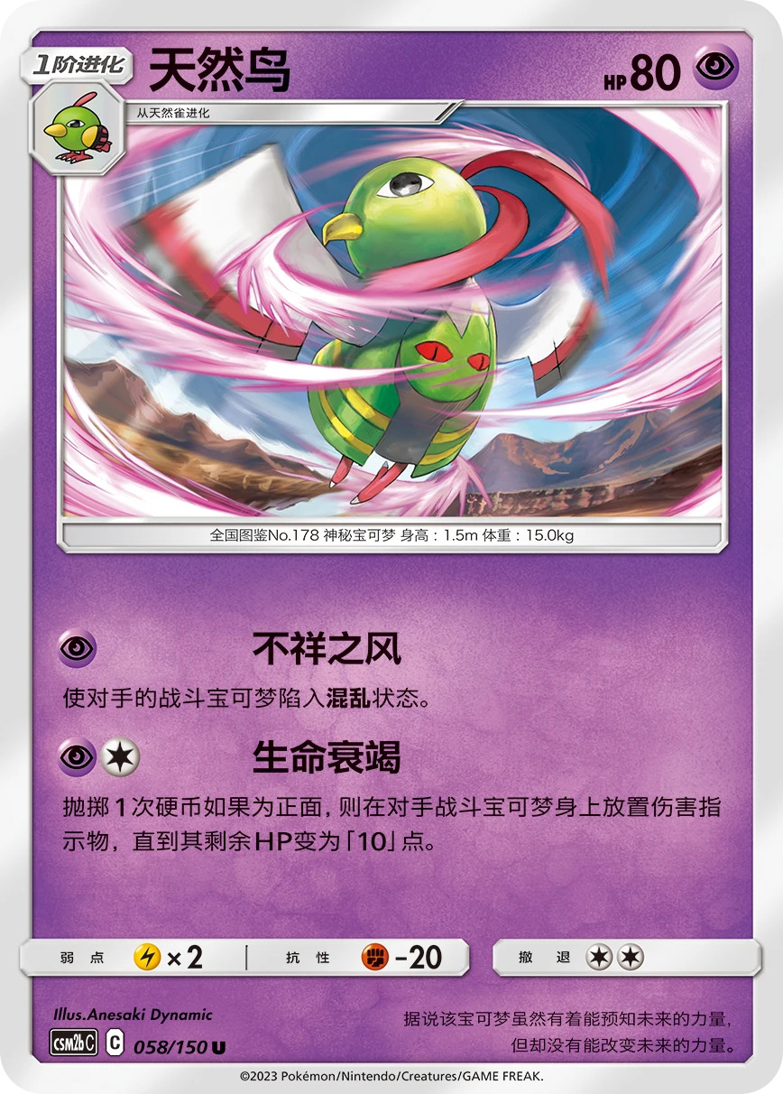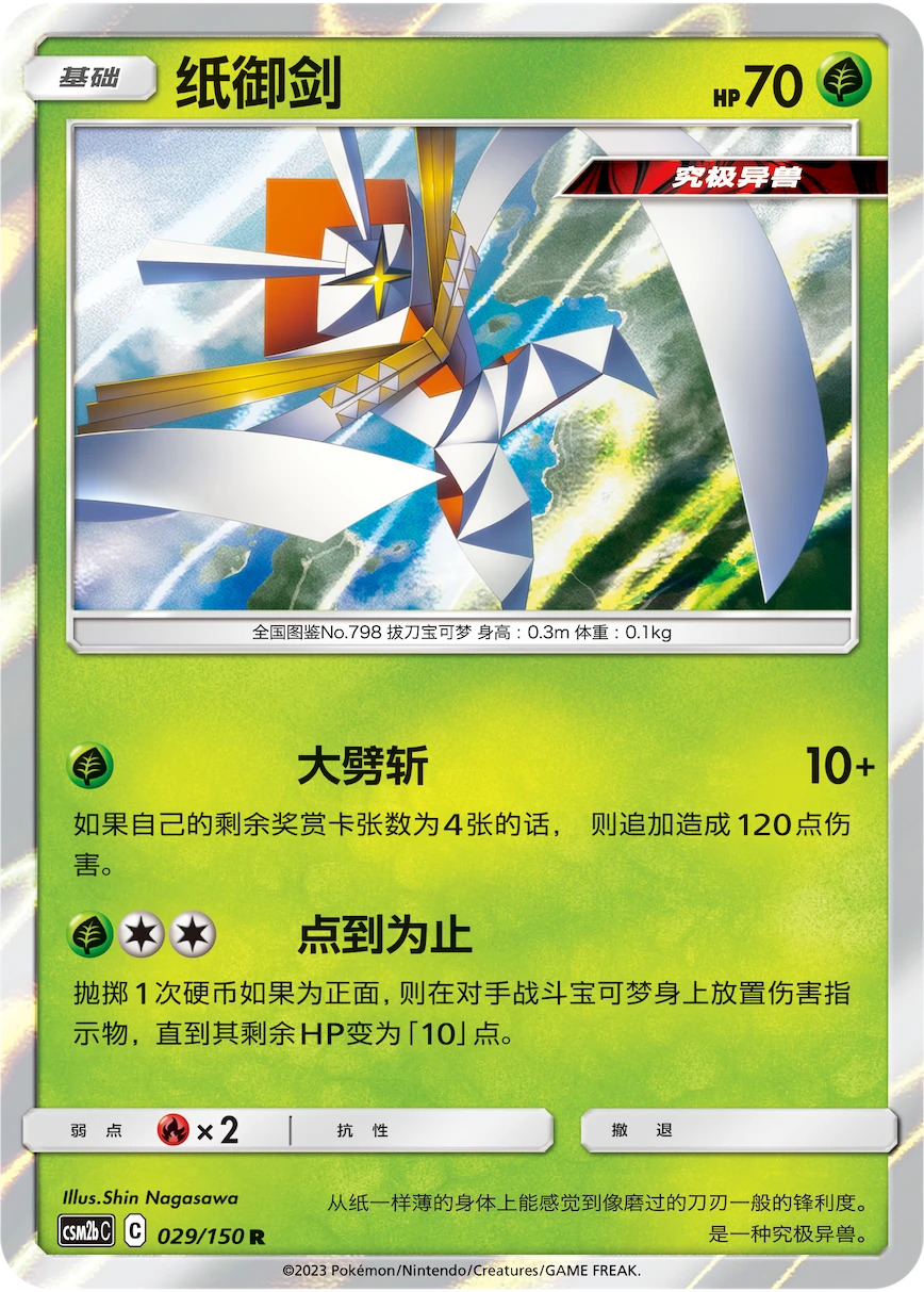 【纸御剑】的招式【点到为止】同样可以让对手的战斗宝可梦只剩下10HP。由于【天然鸟】需要进化,让身为基础宝可梦的【纸御剑】来配合也是不错的选择哦!