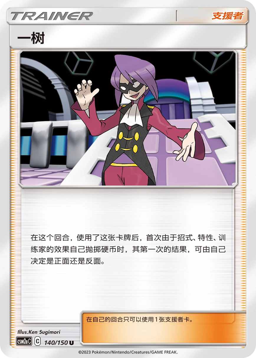 【一树】是一名有着神奇能力的训练家!每当使出【一树】时,该回合因招式、特性或是效果而需要抛掷硬币时,可以由己方来决定正反面。 改变抛硬币的结果,这可是非常强力的效果!配合好搭档【天然鸟】的招式【生命衰竭】,不论对方战斗宝可梦是谁,都可以使其HP仅剩10点。场上如果还有【惩戒祠堂】,一回合昏厥【TAG TEAM】宝可梦也不在话下!