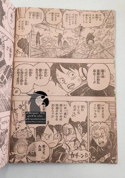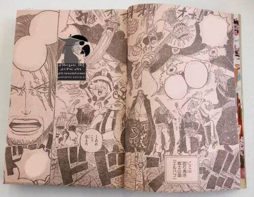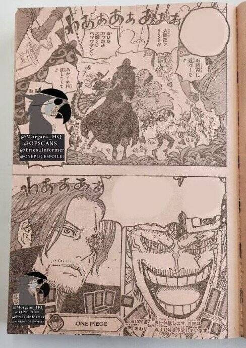 《海贼王》1076话情报公开,路飞决定和路奇、卡库联手对付炽天使,虽然索隆不信任他们,路飞还是打开了他们手铐。贝加庞克本体在研究所里的一个秘密监狱中苏醒,和他被关在一起的还有之前失踪的CP特工们。另一边,香克斯与布洛基东利一起走向战场。在战斗开始前,香克斯让洛克斯达前去给基德带话:“洛克斯达,告诉基德他现在可以挑战我们了!!或者他可以交出路标正文并离开!!”