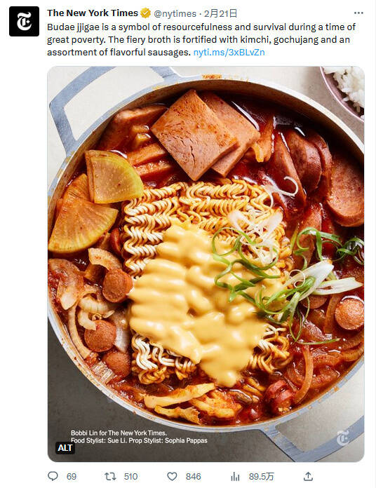 美媒《纽约时报》发布了一则由韩裔美国人撰写的“韩式部队锅”食谱,其中介绍称这道菜起源于朝鲜战争,最早是用“美国陆军剩余的口粮”制成,将泡菜、韩式辣酱、午餐肉、香肠“大乱炖”后,再铺上一层美式奶酪,最后搭配白米饭食用。