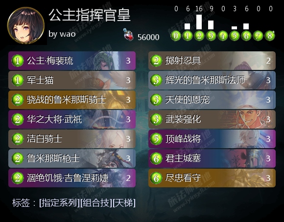 这套牌有许多能高效堆叠已进场指挥官数的组件,例如1费的军士猫、公主·梅裴琉、结晶尽忠看守,以及能大量刷指挥官数的顶峰战将。由于舍弃了边境的见习骑士,顶峰可以稳定拉出3个指挥官;又因为放弃了辉光的鲁米那斯法师以外的3费随从,这套牌还能在使用顶峰的当回合进化辉光,再铺1个指挥官,做到“1牌5任务”。