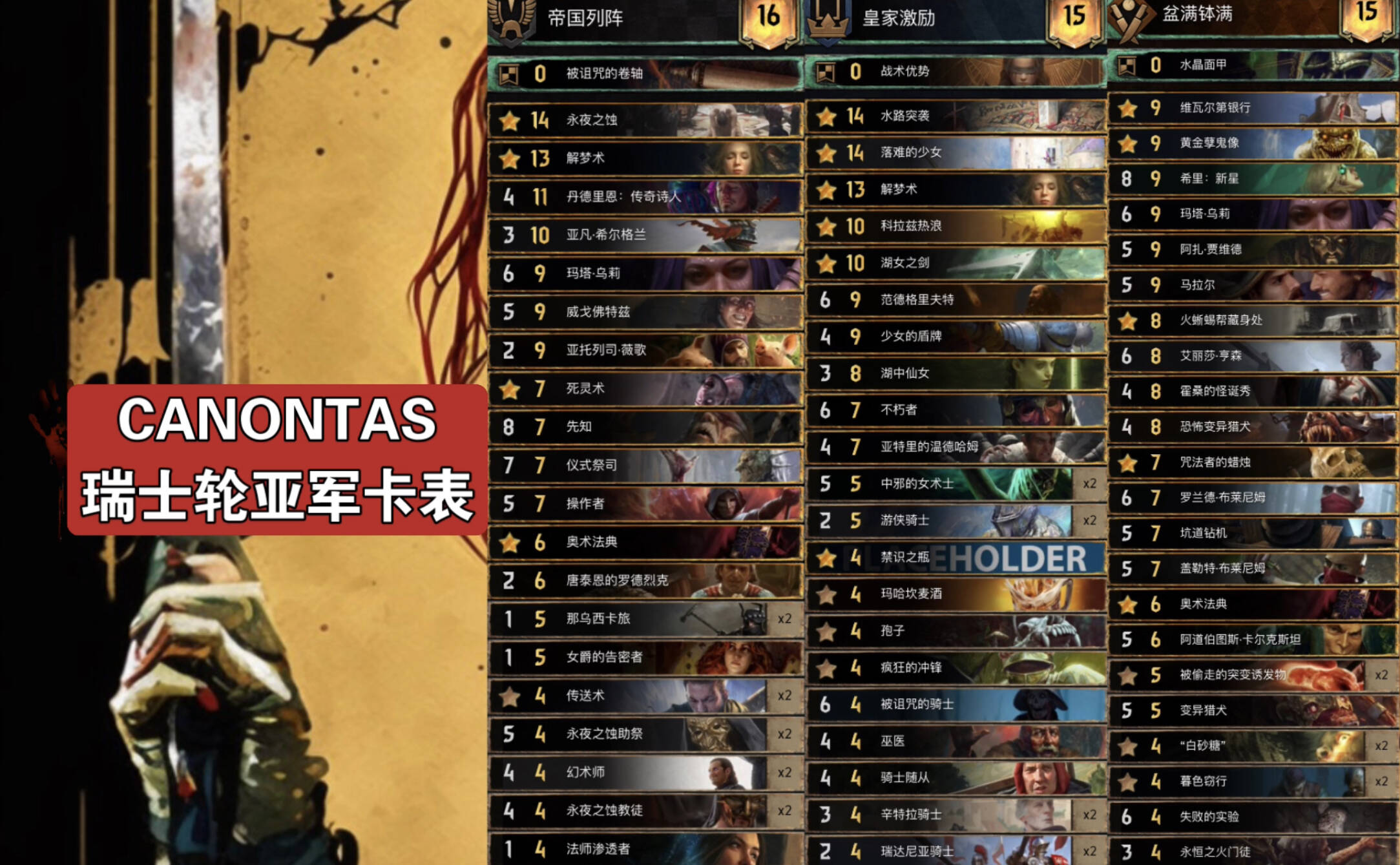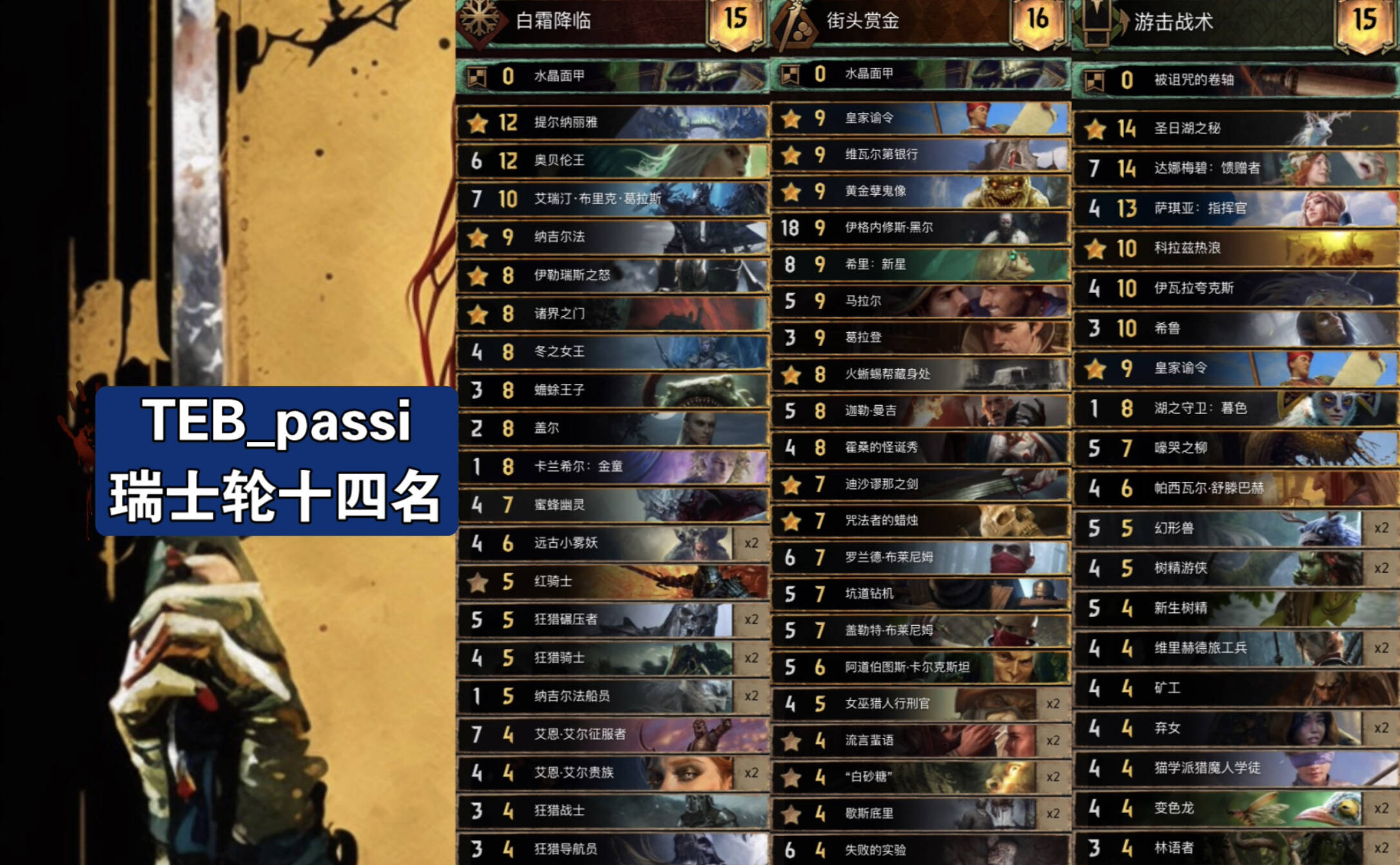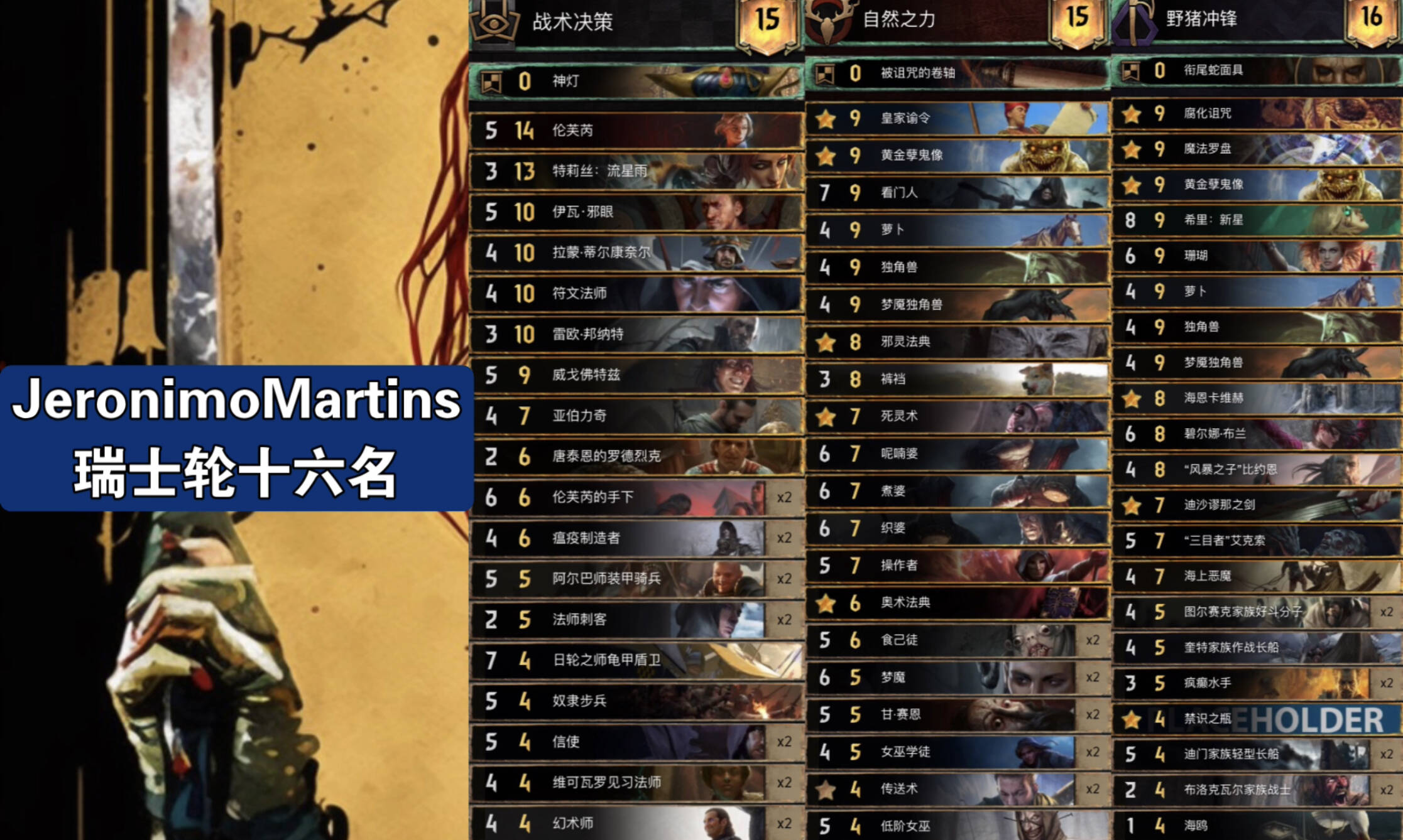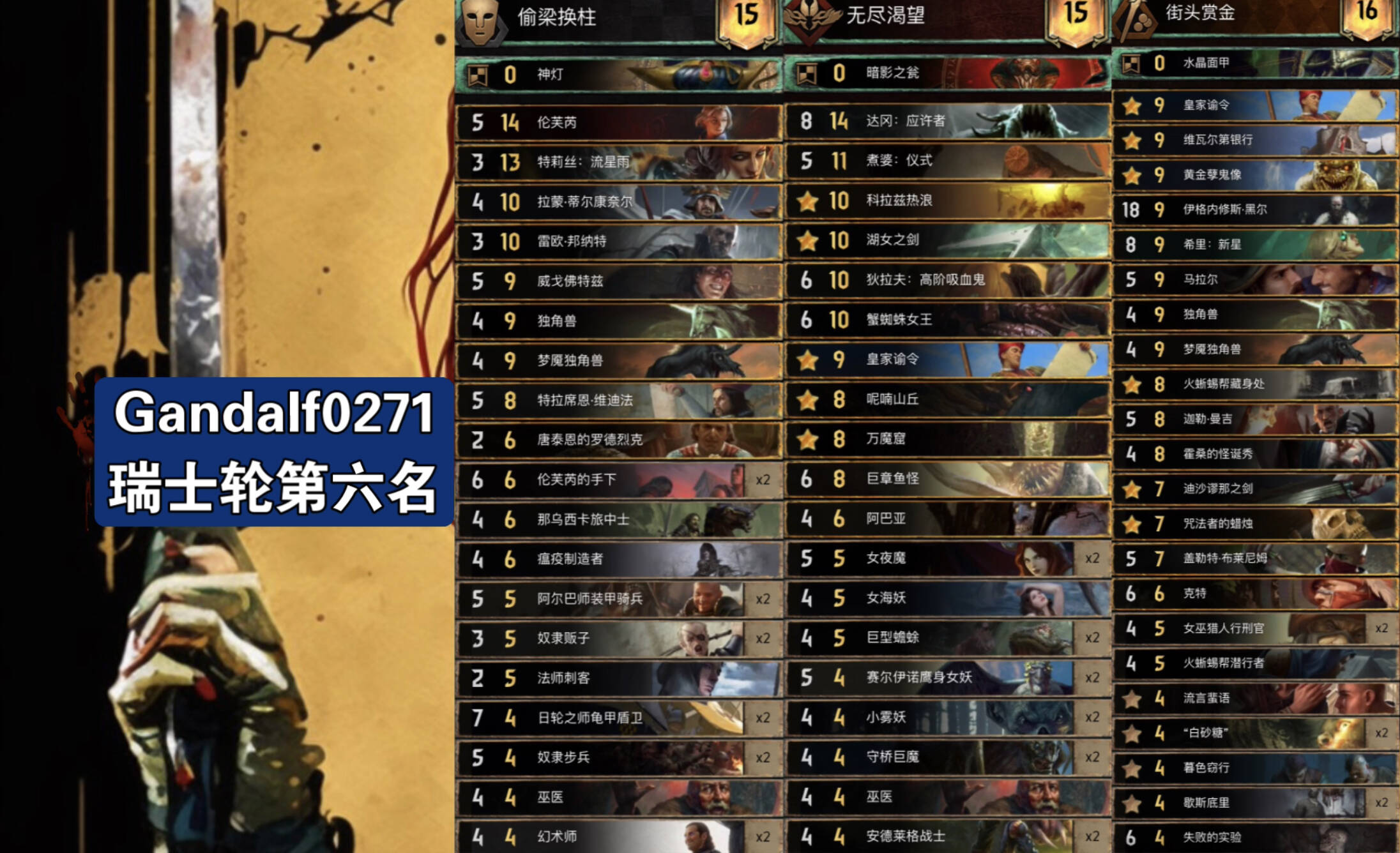 本期卡表链接可看:https://tournaments.playgwent.com/tournament/1db437134e847372460fa12f70685f83/participants