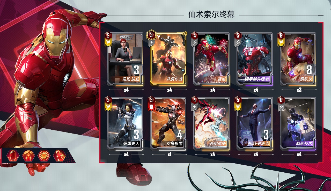 钢甲部件组装4:每张减费拿但是打出卖随从可以卖5宝石,最后打出四张送终幕打出获得钢铁侠卖出免费获得6宝石。