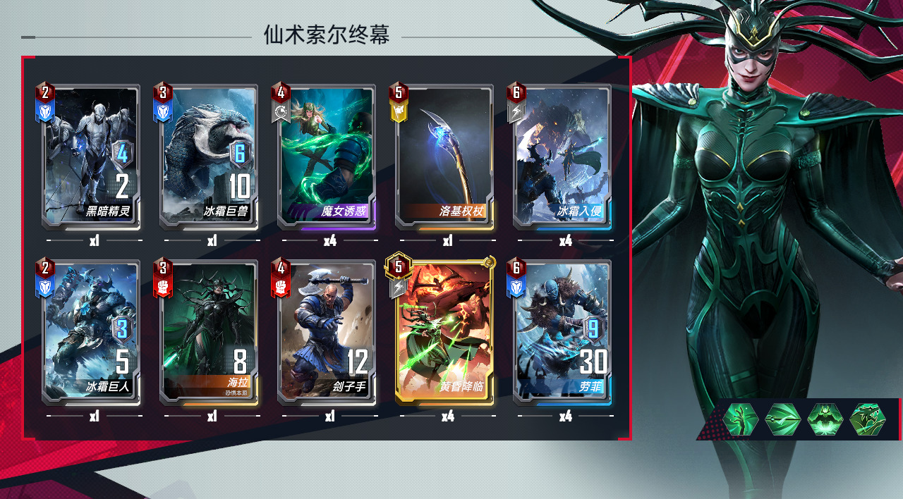 黄昏降临4:看看有没有概率出苏特或女巫师来夜巡打海拉终幕,也可以配合带的一张刽子手(方便滤卡)利用两个空位斩一个对方场上最大的随从,没有也无妨,反正卡位不冲突,不是主要事项。