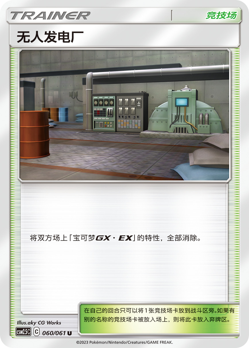 综合来说,无人发电厂是一张攻守兼备的场地卡,他的效果很强,但强的点不在于可以可以无脑拍出autowin,而在于游戏过程中与对手的博弈。如何使用好这张卡,已经如何应对这张卡,将会是2.5版本的热门话题。同样的随着剑盾系列推出,不再推出宝可梦GX而改为宝可梦V,新卡将不会被无人发电厂制约,这也会让无人发电厂的压制力逐渐下降直至通顶雪道的问世彻底沦为时代的眼泪。