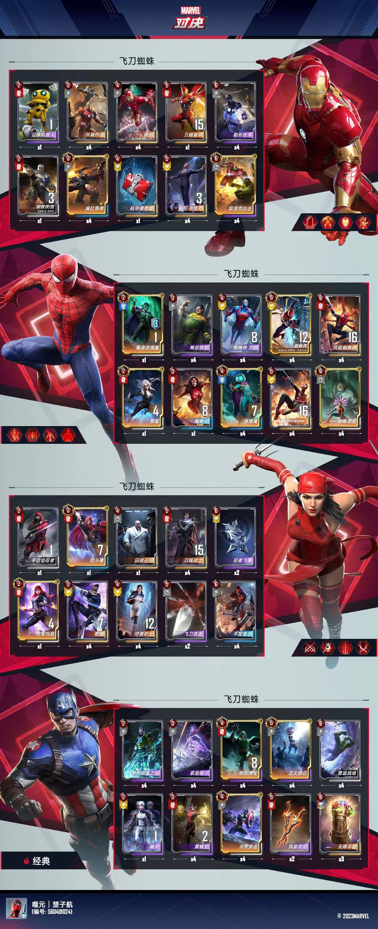 5.情报:关键点在几个,一:记得换牌,不能被6寡砍死减员太多,二:潘妮帕克不吃狙击,大胆的往前摆 三、吃7不要留小嘲讽,不要给刀锋机会 四、没上过的究极蜘蛛最好星级高,带凤凰剑摆最后 五、中期遇到可以开锁小,可能会开钢决入你,他的飞刀大概率比你多 六、中期遇到免费的蛛丝可以来一张,抬他走 六、一定要打蛛丝,刺杀摆二号位找幻视