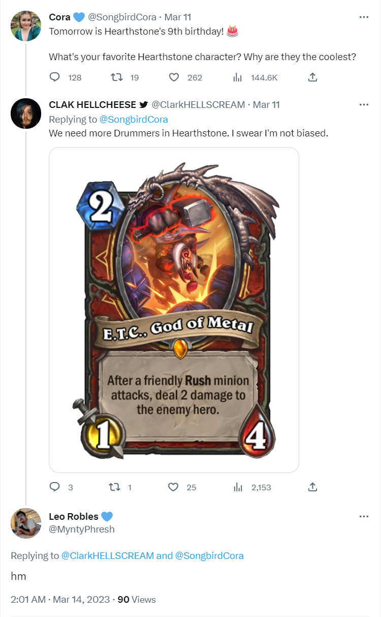 Leo Robles随后让这个猜想变得更明显。Cora前几天发过一贴,问大家炉石9周年了最喜欢哪个角色,有人就回答了ETC,今晚Leo去挖了这个坟。
