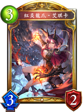 红炎龙爪·艾琪卡适合环境,可以高效解决狂乱鬼、财宝皇、妖精妖等对手的1血随从。艾琪卡还能在觉醒后回复进化点,支持爱丽丝。