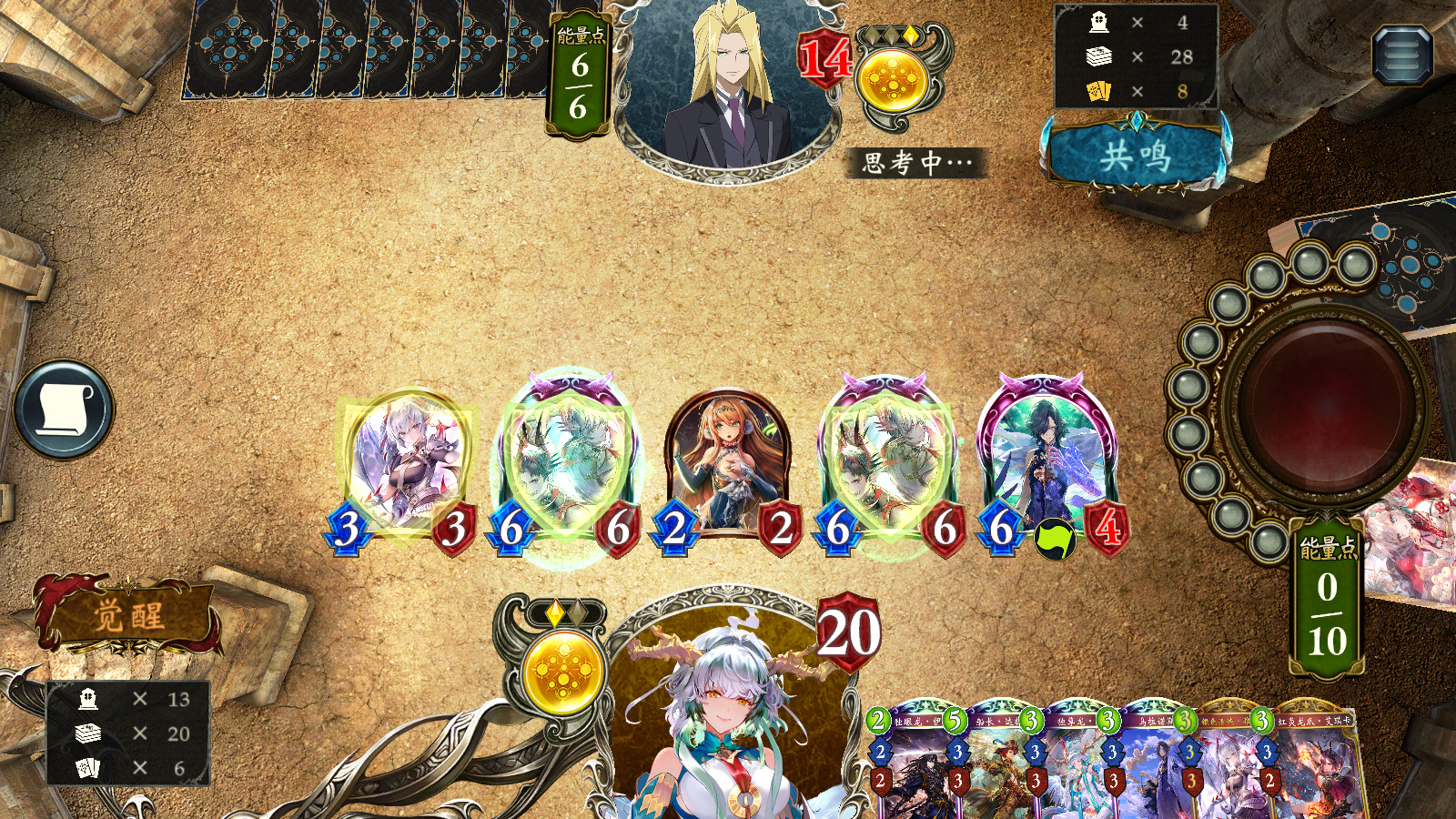 中期继续跳费,兼顾解场与过牌。在这个过程中,通过独尊龙·四龙、艾琪卡等组件解场。有多张独眼龙·伊达政宗或解场压力太大的话,也可在觉醒后、抵达10费前卖掉伊达。