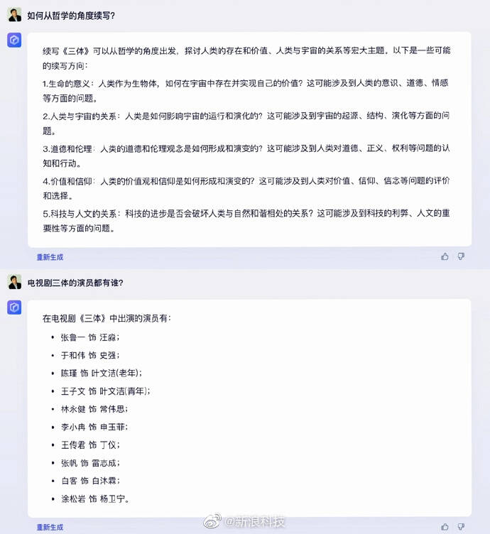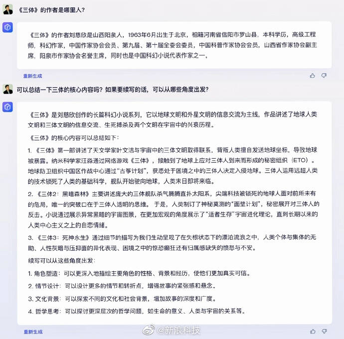 发布会现场,百度创始人、董事长兼首席执行官李彦宏展示了文心一言在五个使用场景的表现,包括文学创作、商业文案创作、数理推算、中文理解和多模态生成。在文学创作场景中,文心一言根据对话问题将知名科幻小说《三体》的核心内容进行了总结,并提出了五个续写《三体》的建议角度,体现出对话问答、总结分析、内容创作生成的综合能力。此外,文心一言准确回答了《三体》作者、电视剧角色扮演者等事实性问题。面对“于和伟和张鲁一有哪些共同点”、“于和伟和张鲁一谁更高”这类问题,文心一言也基于推理能力得出了答案。