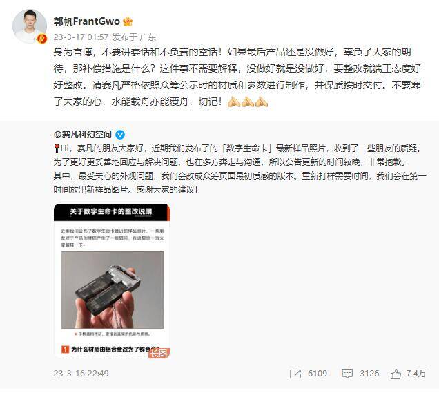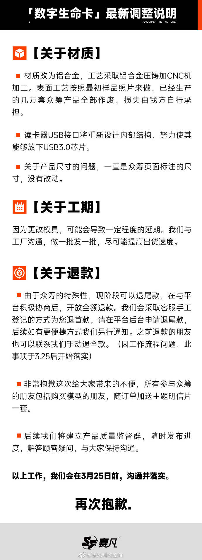 日前,赛凡科幻空间经历了《流浪地球2》周边数字生命卡的翻车事件,起因是原本宣传的「数字生命卡」铝合金制作,昨日发布了调整说明,「数字生命卡」改为锌合金制作。