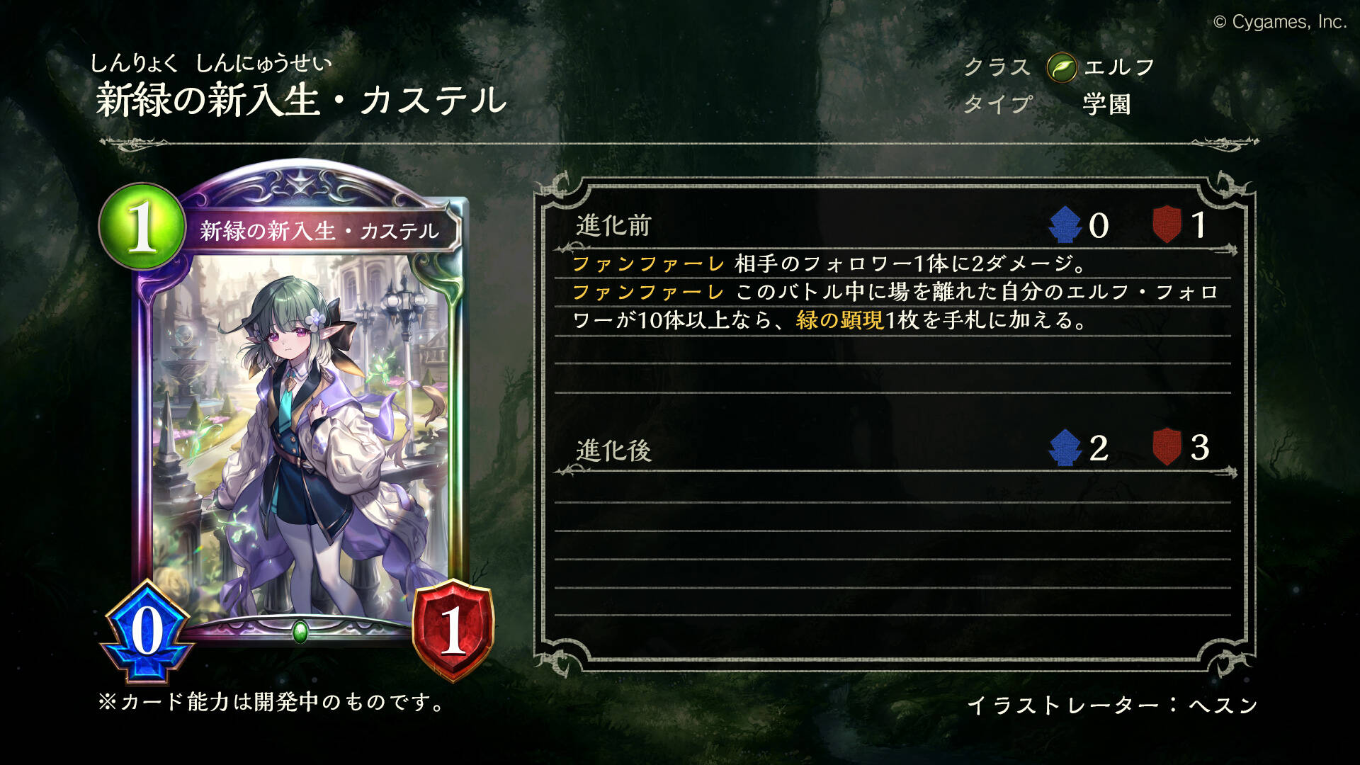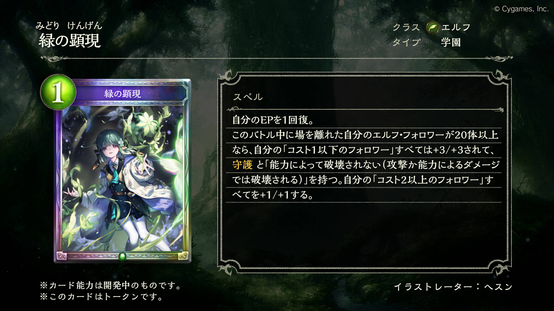 入场曲 如果本局对战中从自己战场上离开的精灵随从数量为10以上,则增加1张绿色显现到手牌中。